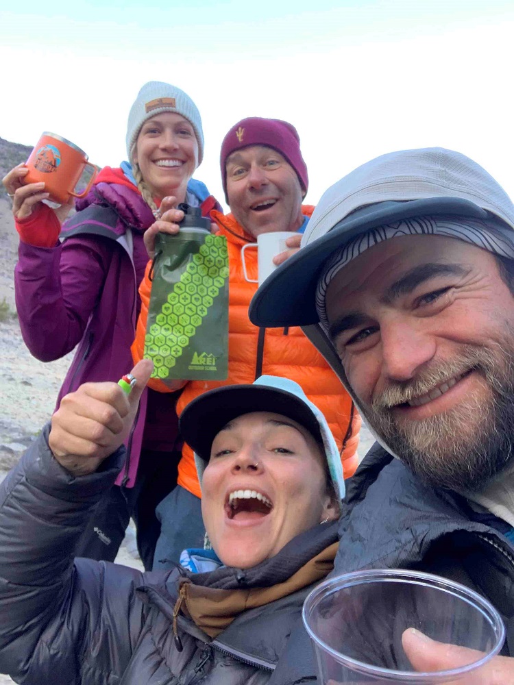 Back Safely at Basecamp: Patti and Andy with guides JC and Hope